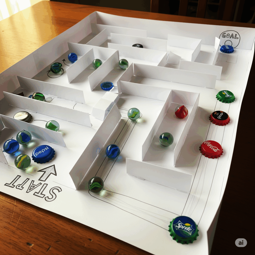 画用紙で迷路を作り、ビー玉やペットボトルキャップを転がしてゴールまで運ぶゲームに。工作と遊びがセットになった楽しい研究になります。